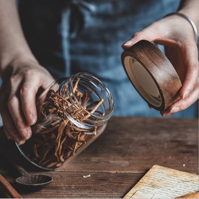 Eco Friendly Custom Logo Empty Wooden Lid Clear Kitchen Canisters Transparent Glass Jar